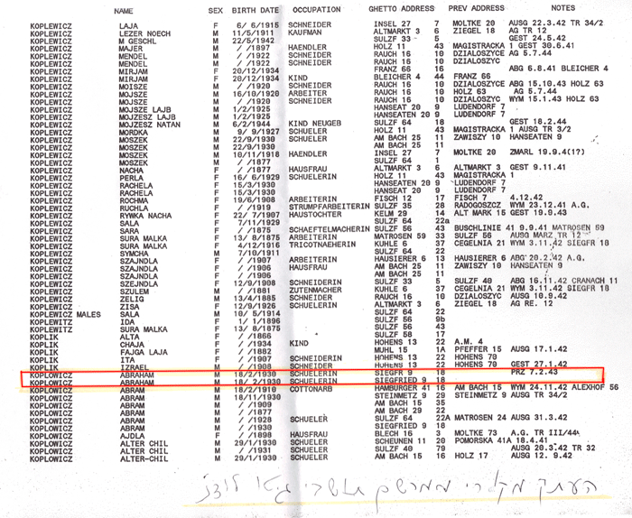 אברהם קופלוביץ', נולד:18.2.1930 , מקצוע: תלמיד, הכתובת בגטו: Siegfriedstr 9