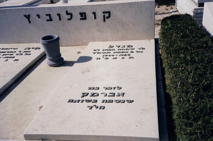 מצבתו של מנדל קופלוביץ, ועליה חרוט גם שמו של בנו אברמק |