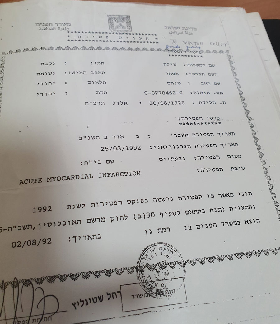 תעודת הפטירה של אסתר שילה בת מנחם 1992 |