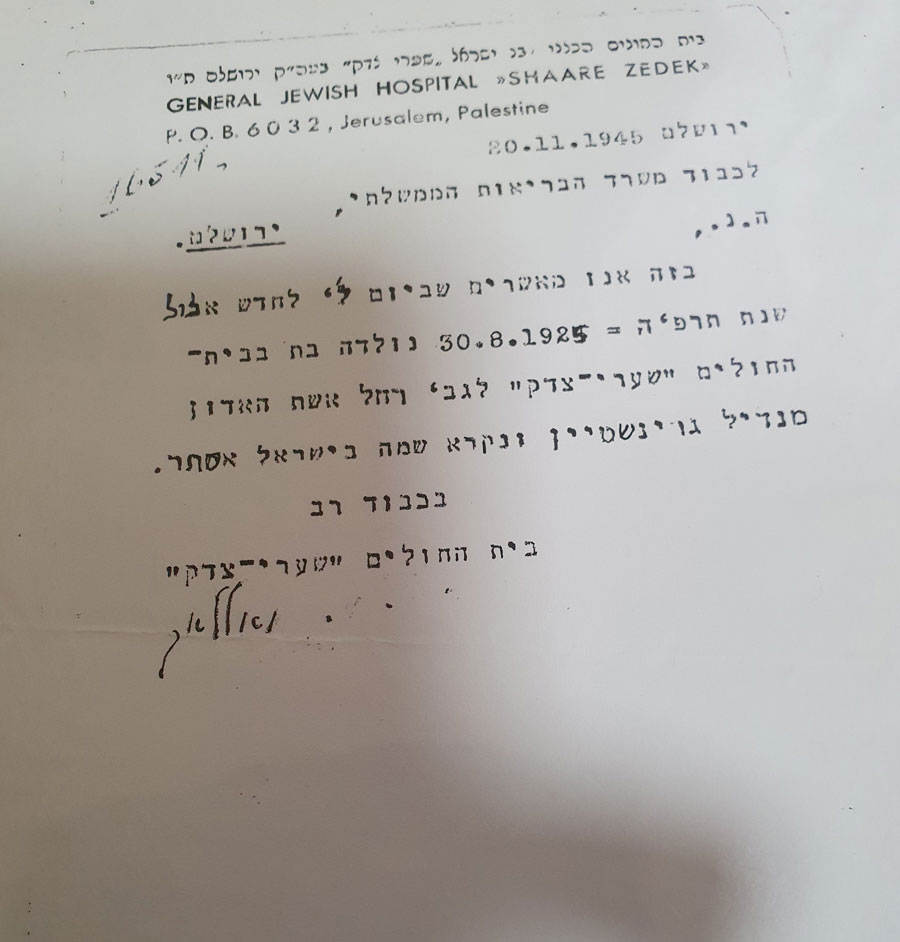 תעודת הלידה של אסתר בת רחל ומנדיל גרינשטיין