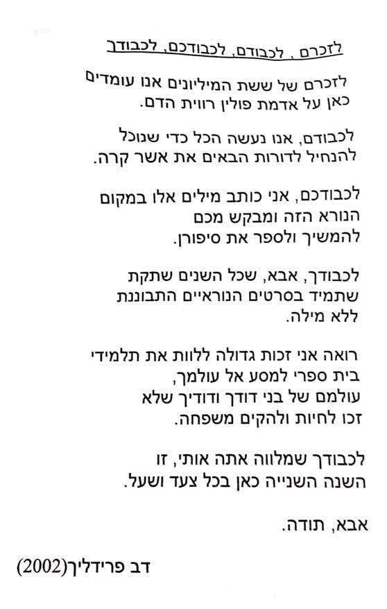 את הזר השלישי הניחו פרופ' חנוך הוד, חבר הנהלת הארגון עם ילדיו ונכדתו - דור רביעי לניצולי השואה - לזכר אביו פייבל פיין ז"ל ולזכר אימו - איטה לבית גרנד. שניהם היו בגטו עד חיסולו וגרושם לאושוויץ. היחידים שניצלו מכל בני משפחתם.