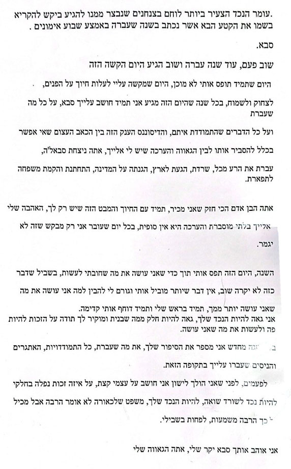 סיפור של חיים – לכבודך, אבא שלנו לזכר השואה, לחגיגת חייך, ולכבוד יום הולדתך ה־96 אבא יקר , היום, כשכולנו מרכינים ראש לזכר שישה מיליון יהודים שנרצחו בשואה – אנחנו מרימים את הראש ומביטים בך . ביום שבו מדליקים נר של כאב – אנחנו מדליקים גם נר של תקווה . וביום הזה ממש – 24 באפריל – אנחנו לא רק זוכרים את מה שאבד, אלא חוגגים את מה שניצל: אותך. את חייך. את הבחירה שלך בחיים . לא במקרה יום השואה השנה נופל בתוך חג הפסח – חג החירות . כי כמו סיפור יציאת מצרים, גם הסיפור שלך הוא סיפור של תופת – ושל גאולה. של עבדות – ושל חירות. של לילה אפל – ושל בוקר מלא אור . נולדת בלודז‘ בשנת 1929 ,בן רביעי למשפחה חילונית, צנועה ואוהבת . ילד סקרן, יצירתי, חייכן, שלמד עברית בגיל ארבע, אהב לצייר, לשחק, לצחוק – כמו כל ילד . אבל בגיל עשר הכול התהפך . הנאצים פלשו. בתי הספר נסגרו. הגטו הוקם. הרעב, הפחד, חוסר הוודאות – הפכו לחלק מהיומיום . ילד קטן הפך לפועל במפעלי הגטו – מסמרים, צעצועים, מכונות תפירה – רק כדי לקבל צלחת מרק. כי רק מי שעבד – אכל . ובתוך כל החושך הזה – גם רגעים קטנים של אור : מדריך פולני ששלח סנדוויץ‘, חבר שחילק לחם, ואמא אחת – ברכה – שחיבקה אותך וניסתה להזכיר לך מה זה להיות בן אדם . עברת סלקציות, מחנות עבודה, פשיטות . הסתתרת עם המשפחה בבונקר – עד שיום אחד שמעתם את הרעש . הצבא האדום שחרר את העיר. ראית את הטנקים – והבנת: זה נגמר. אתה חי. אתה חופשי. ומאותו רגע – בחרת בחיים . עלית לארץ. פגשת את אמא שלנו, טניה. עבדת, שירתת, הקמת בית . שלושה ילדים. עשרה נכדים. ארבעה־עשר נינים . וכל זה – אתה אומר – זו הנקמה שלך בנאצים . לא בשנאה. לא בנקמה . אלא באהבה. בהמשכיות. בחיים. במקום שבו ניסו למחוק אותך – הקמת שושלת . במקום שבו ניסו לקבור את העתיד – בנית עתיד . ובמקום שבו כמעט נפלת – עמדת. ואתה עדיין עומד. ואנחנו עומדים כאן לצידך, גאים ונרגשים. אתה לא רק ניצול. אתה עד. אתה אבא. אתה סבא . ואתה ההוכחה – שהחיים חזקים מהמוות . היום, כשאתה כאן, בטקס של קהילת יוצאי לודז ,‘ בתוך כאב הזיכרון ובתוך חג החירות – אנחנו מודים . על מה שהיה. על מה שיש. ועל מה שעוד יבוא. כי חירות היא לא רק זיכרון מהעבר . היא משאלה חיה, כואבת, דחופה. והלב שלנו – גם ביום הזה – עם אחינו ואחיותינו שעדיין לא שבו מן השבי . ואנחנו מתפללים ש*במהרה ישובו לביתם*, עטופים במשפחה – בדיוק כפי שאנחנו עטופים בך היום . אז אבא יקר , יום הולדת 96 שמח . תודה על החיים . תודה על התקווה . תודה על מי שאתה . ותודה על שהוכחת לכולנו – שהחיים הם הניצחון.