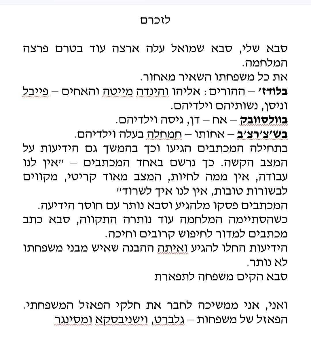 אני, כנכדם, חש חובה עמוקה לא רק לזכור את שמם – אלא להמשיך את דרכם. בין אם בלימוד, בעשייה קהילתית, או רק בעצם העובדה שאני עומד כאן היום – חופשי, חי, יהודי, גאה, ובעל זהות – הרי זו התשובה הגדולה ביותר לאויבינו – וזו הירושה הגדולה ביותר מהם.